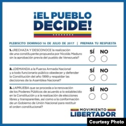 En el proceso se le preguntó a los venezolanos si rechazan la asamblea constituyente impulsada por Maduro, si piden a la Fuerzas Armadas que protejan la Carta Magna vigente y si aprueban la remoción de los titulares de los Poderes Públicos, acusados de servir al chavismo; la celebración de elecciones y la conformación de un gobierno de unidad nacional.